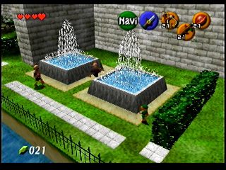 He'll tell you how he managed to fall asleep and then runs off once hearing that Malon is looking for him. There are two crates in the vicinity, pull/push them off the edge of the path into the moat, (one on top of the other) and you should hear a chime to tell you it's done. Climb up on top of the box and jump across to the small drain hole.